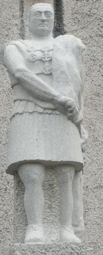 Der da stets kampfbereit auf dem Sockel posiert ist niemand geringeres als St. Gereon, ehemals hauptberuflicher Märtyrer. Auf der Vorderseite des Sockels ist in wenigen Worten die Beziehung zwischen St. Gereon und Rheinkassel erläutert.