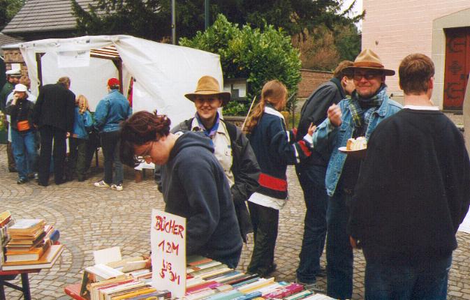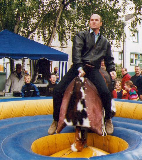 Am nächsten Morgen traf man sich gegen 8:30Uhr (Halb neun??? So früh?) "O´p d´r Eck" und legte anschließend einen Kranz am Ehrenmal in Langel nieder, bevor man sich zu Fuß Richtung Kirche in Rheinkassel aufmachte um dort dem Festgottesdienst mit einem Bischof aus Peru beizuwohnen. Gelegenheit zu Speisen und Tranken -Quark!- zu Speis und Trank nach dem Gottesdienst gab es reichlich. Da waren zum einen der Kölschstand der Hunnen und der Pilsstand (Wo der Webmeister zu finden war) der Schloppkrade auf der flüssigen Seite. Feste Nahrung+Wein gab es am Grillstand der Fastelovenspöppcher, für Kaffee+Kuchen+Schnittchen gabs den Stand der Jivvelshöhner. Eine Rollrutsche der KITA sorgte bei den Pänz für kurzzeitige Geschwindigkeitsrauschmomente. Die Pfandfinder hatten u.a. einen kleinen Trödelstand für kleine Preise aufgebaut. Die eigentliche Hauptattraktion des Wochenendes war aber die Bullenmaschine, auf der sich Groß, Mittel und Klein im Rodeoreiten behaupten konnte und die für viele witzige Abflüge sorgte (Das sollte auf jeden Fall nächstes Jahr wiederkommen!).