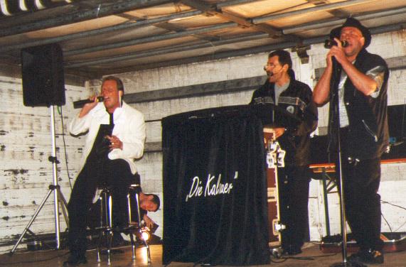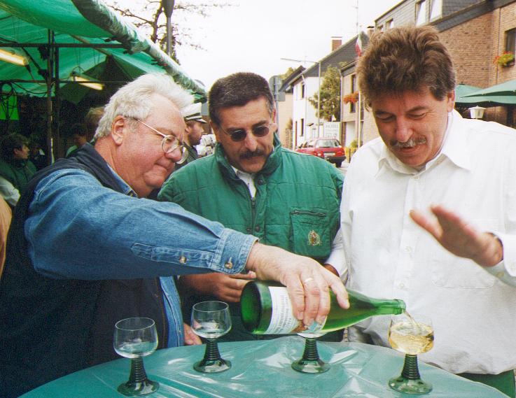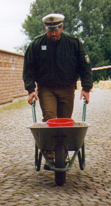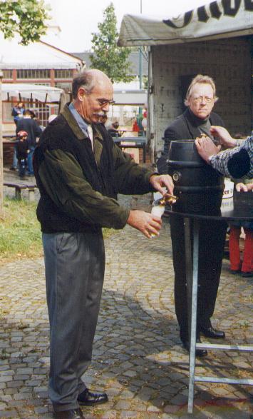 Das erste Kölsch, wie immer eines der wichtigsten Getränke der ganzen Kirmes, wurde samstags gegen 15Uhr durch den 1. Vorsitzenden der Dorfgemeinschaft Armin Rheinfeld nach halbwegs gelungenem Faßanstich gezapft. Schon eine halbe Stunde später fand das Schürreskar-Renne (Schubkarren-Rennen) statt. Wen der Mann in grün hier wegen Geschwindigkeitsüberschreitung verfolgte ist bis dato leider unbekannt. Abends sorgten die "Kalauer"