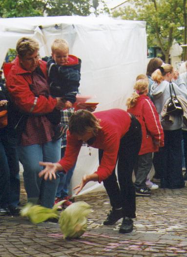 Männer und Kinder mit dem Schubkarrenrennen an der Reihe. "Das ist gar nicht so leicht", rief eine Teilnehmerin den Zuschauern zu, die die Wettstreiter kräftig anfeuerten. Zimperlich gingen diese nicht mit dem Gemüse um: die Rennstrecke war schon bald übersät mit einzelnen Kohlblättern, und die Kohlköpfe waren im Ziel immer etwas kleiner als beim Start.