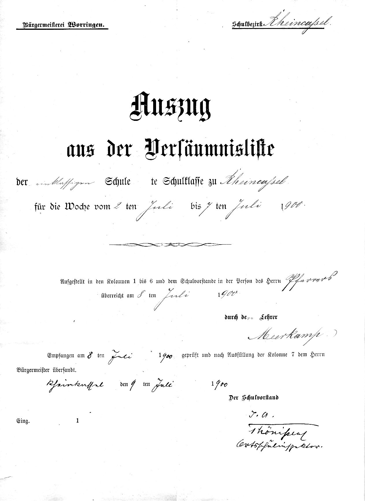 Zu dieser Zeit war an der Schule in Rheinkassel Hermann Meerkamp der Lehrer (Lehrer von 1880 bis 1925). Er war der Großonkel der Mutter von Elisabeth Meurer.