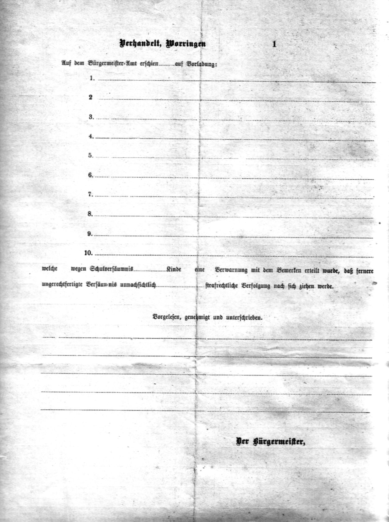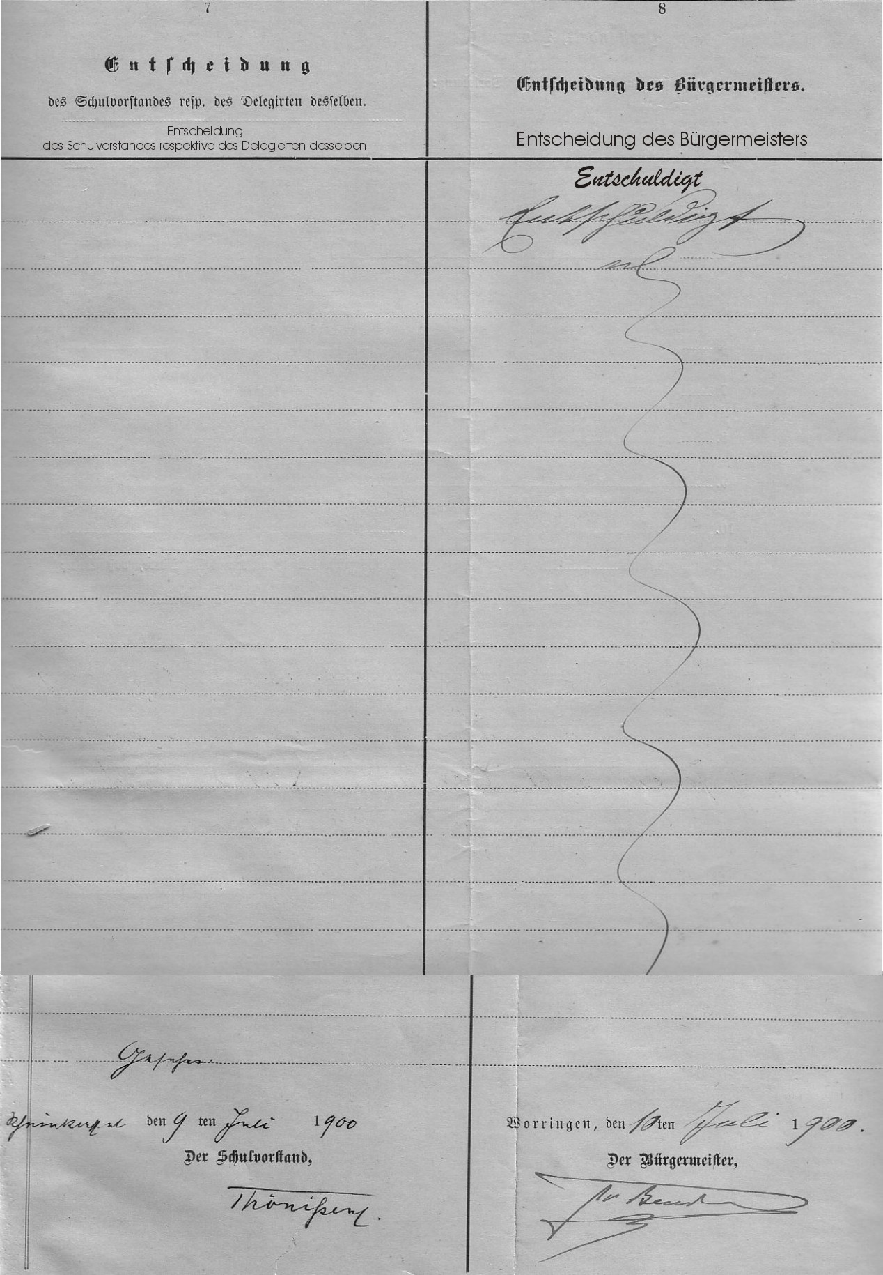 Das Heimatarchiv Worringen hat uns sogenannte Versäumnislisten aus dem Jahre 1900 zur Verfügung gestellt. Darin wurden die Namen der Schülerinnen und Schüler festgehalten, die den Unterricht versäumt hatten. Für jede Woche wurde eine solche Liste erstellt, die dann dem damaligen Bürgermeister von Worringen, Matthias Bender, zur Entscheidung vorgelegt wurden. In den vorliegenden Listen stufte er alle Schüler als entschuldigt ein.
