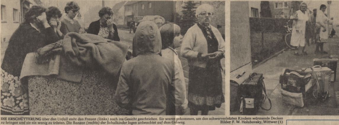 Auf der Straße liegen in beträchtlichem Abstand fünf Kinder. Gaby N. verstirbt noch an der Unfallstelle. Theo Di., Christian De., Thorsten S. und Wolfgang Sch. erleiden Knochenbrüche, einige von ihnen haben auch innere Verletzungen. Noch am selben Tag werden die verletzten Kinder in drei verschiedenen Krankenhäusern operiert. Christian S., der Großvater des kleinen Thorsten, war einer der Ersten an der Unfallstelle und beschreibt die Szenerie als genauso entsetzlich wie das bombardierte Köln.