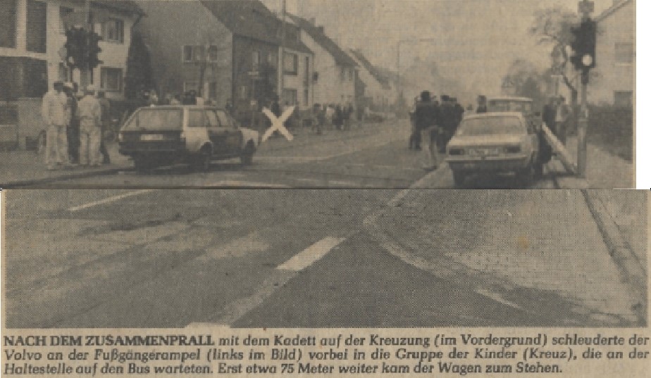 Einige Augenblicke später, so die Polizei, beabsichtigt die 35-jährige Hausfrau Rita Z. mit ihrem Kadett vom Feldkasseler Weg auf die Alte Römerstraße einzubiegen. In diesem Moment nähert sich der 48-jährige Klärmeister Manfred W. mit seinem Volvo in Richtung Worringen. Auf der Kreuzung kollidieren beide Fahrzeuge. Der Kadett wird herumgerissen und bleibt neben der Fahrbahn stehen. Der schwere Volvo schleudert jedoch auf die gegenüberliegende Seite, durch die wartende Gruppe von Kindern hindurch und kehrt schließlich zur Fahrbahn zurück. Erst 75 Meter hinter der eigentlichen Unfallstelle gelingt es Manfred W., der rechts eine Handprothese trägt, sein Fahrzeug zum Stehen zu bringen. Später werden keinerlei Bremsspuren gefunden.
