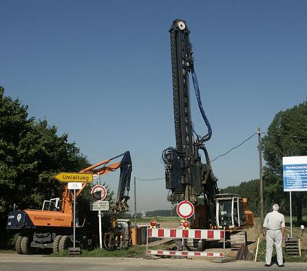 Wenn man derzeit auf dem Damm zwischen Langel und Worringen steht, bebt die Erde. Eine mächtige Ramme wandert auf der Deichkrone vom Hitdorfer Fährweg aus langsam Richtung Norden und treibt dabei bis zu 16 Meter lange Spundwände in den maroden Wall. Mit einem Druck von 90 Tonnen werden die dicken Stahlbohlen ins Erdreich "einvibriert", erklärte Volker Lüdicke, Mitarbeiter der Stadtentwässerungsbetriebe (SteB), bei einem Ortstermin. Neben Flittard, Rodenkirchen und Westhoven sei der Langeler Damm "die wichtigste Stelle" bei der Umsetzung des Hochwasserschutzkonzeptes, so SteB-Chef Hubertus Oelmann.